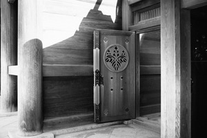 The photograph captures an intricately carved wooden door partially ajar, inviting curiosity and intrigue. Soft shadows dance across the textured surface, enhancing the warmth of the wood while casting a subtle sense of mystery. The monochromatic palette emphasizes the architectural details and evokes a timeless, serene atmosphere.