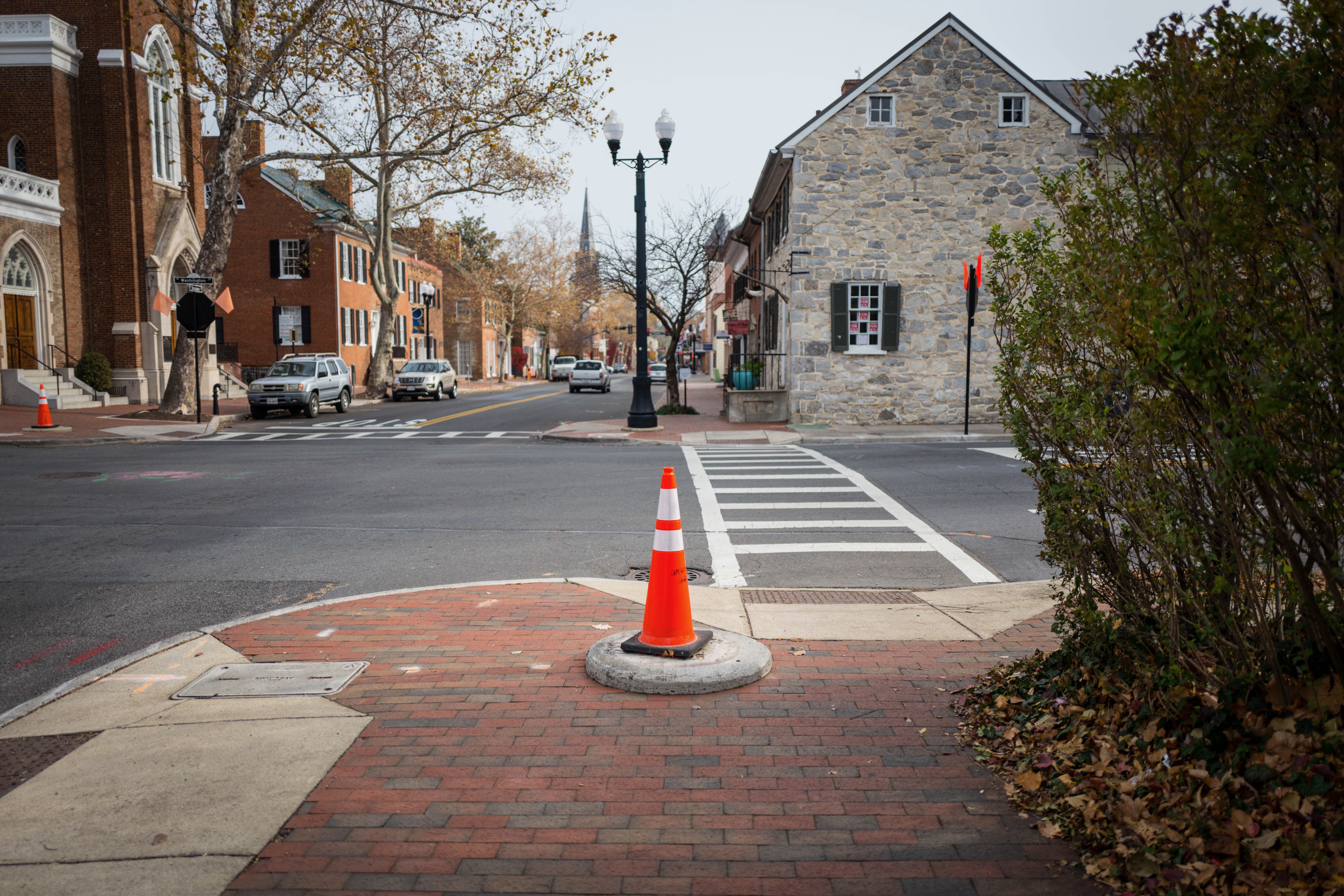 This photograph captures a quiet urban intersection, framed by charming historic buildings and leafless trees, hinting at the transition of seasons. A lone traffic cone stands prominently in the foreground, drawing attention and creating a sense of stillness amidst the subtle movement of the street. The muted natural lighting lends a calm, almost contemplative mood to the scene, inviting viewers to pause and observe the simplicity of everyday life.