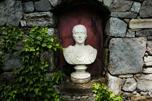 A weathered stone bust rests serenely in a dark alcove, partially embraced by vibrant green ivy. The soft, diffused sunlight casts gentle shadows, enhancing the statue's solemn expression against a backdrop of rustic stones and muted red hues. This composition evokes a sense of timelessness and quiet reflection, inviting viewers to ponder the passage of history.
